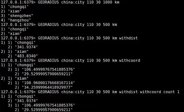 redis> GEORADIUSBYMEMBER Sicily Agrigento 100 km #以成员Agrigento为中心,查询其半径100km以内的name
