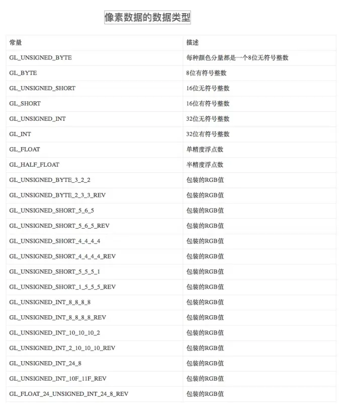 //参数6:type,解释参数pixels指向的数据,告诉OpenGL使⽤缓存区中的什么数据类型来存储颜⾊分量,像素数据的数据类型(参考表如下)