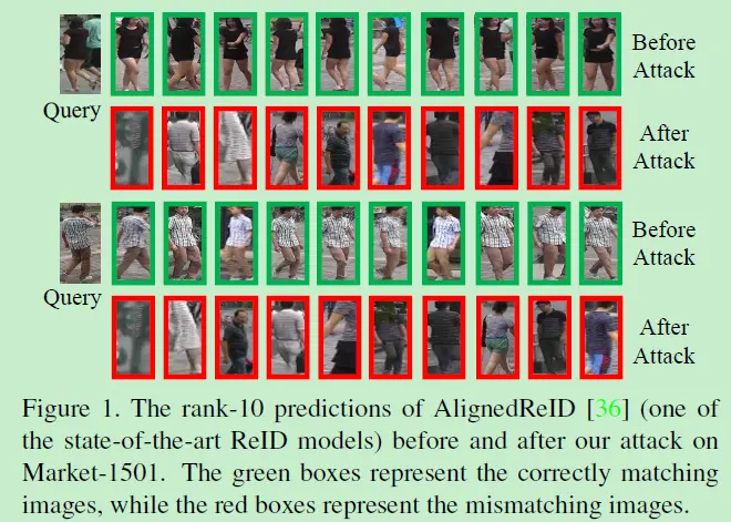 另一方面,和category classification,detection或者segmentation这些任务不同,现在流行的对抗攻击方法并不能直接适用于一个ranking问题。而且ReID图像数据的domain在不同的时候和不同的摄像机会产生变化,这就使得可以考虑施加跨数据集的黑箱攻击了。此外现有的对抗攻击方法通常具有人类可以感知的有缺陷的视觉品质,而文章做到了使这种攻击特征难以察觉(inconspicuous)