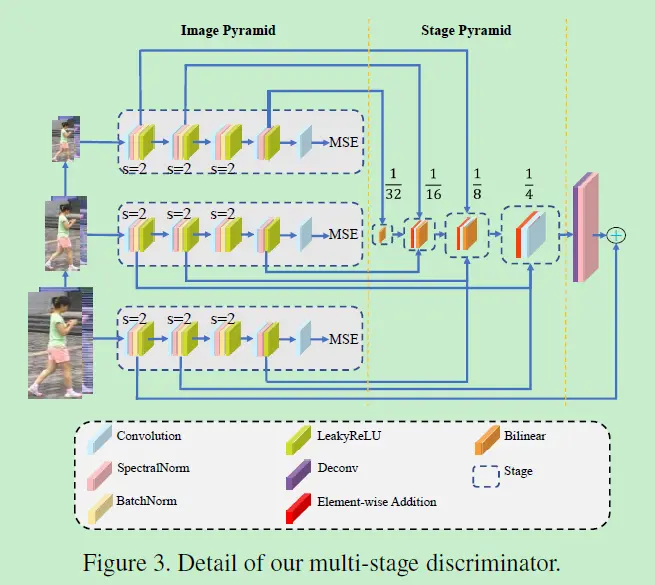 用于特征学习,其中生成器使用ResNet50,对于判别器,作者提出了通过将特征金字塔化成不同层级的多阶段的网络架构用于表征学习,判别器