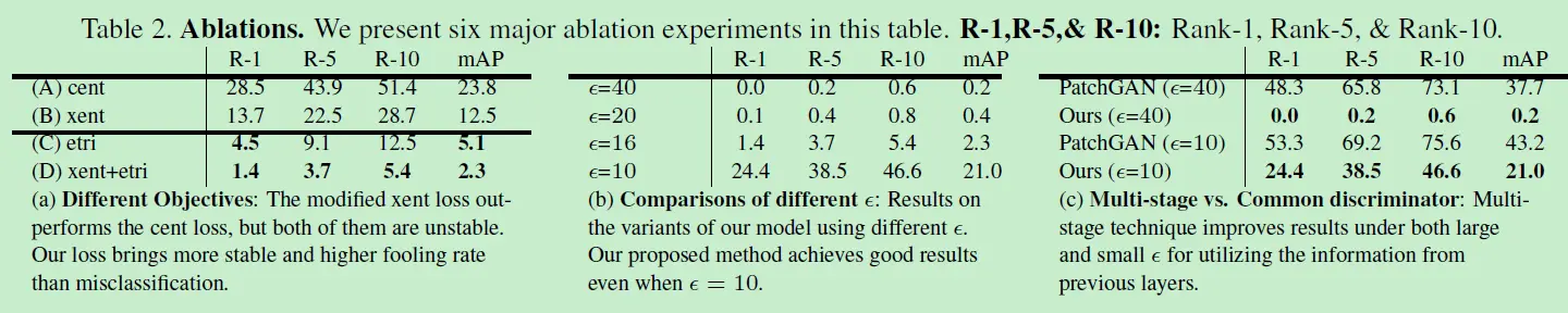 由于需要提取对抗干扰的整体特征,文章设计了通过金字塔分型进行特征学习的多阶段网络架构,该模型在黑箱攻击中有极强的迁移性(transferability)。文章由于使用了可微分的多次采样,使得要攻击的目标像素数是可控的(controllable)。作者还设计了新的感知loss,来提高攻击图像的视觉质量,保证了攻击特征的难察觉性(inconspicuousness)。实验验证了模型的有效性,一度能让ReID模型表现从91.8%降至1.4%。