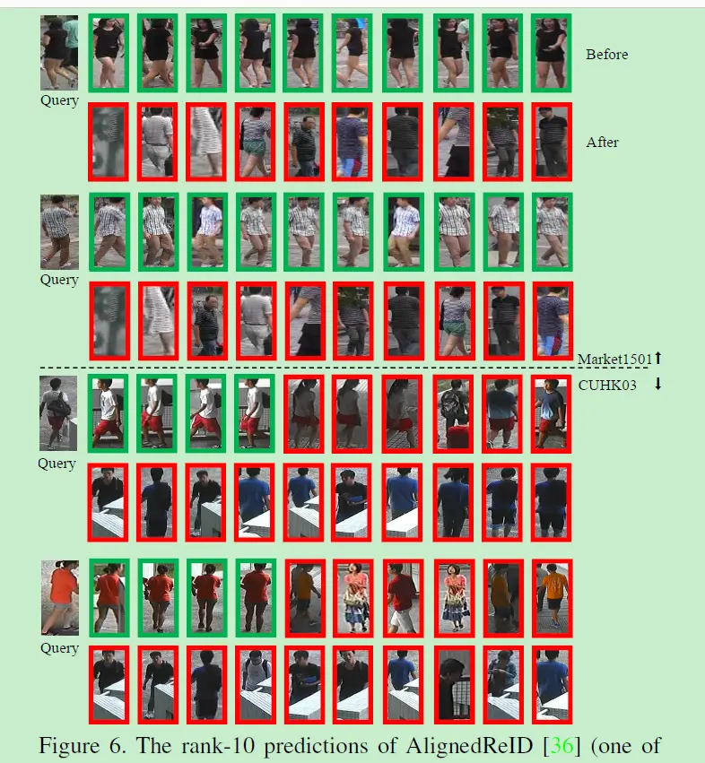 文章在一个SOTA AlignedReID模型进行攻击的Rank 10可视化,攻击后检索的图像均错误了。