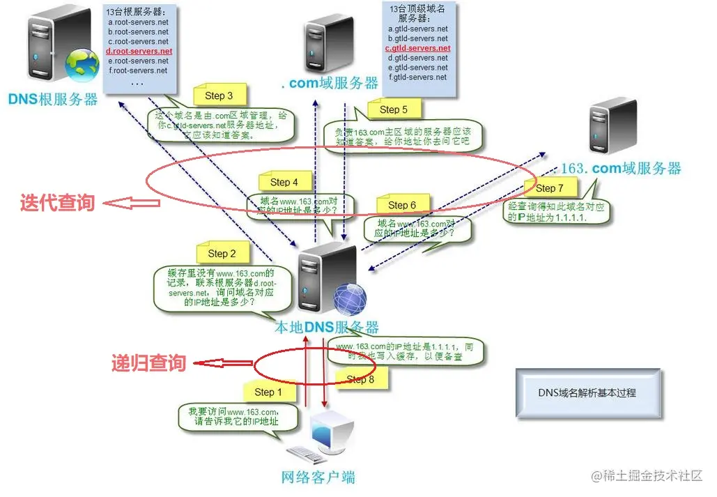 - 根 DNS 服务器不记录域名与 IP 地址的对应关系,而是返回对应的域服务器地址给本地 DNS 服务器,让其去访问查询。类似于此,通过迭代查询,本地 DNS 服务器获得解析的 IP 地址,缓存下来并放回给用户电脑。
