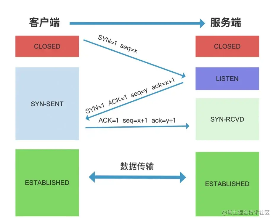 SYN = 1, ACK = 1表示收到连接请求并确认准备连接,并发送自己的序号seq = y,客户端确认序号ack = x + 1