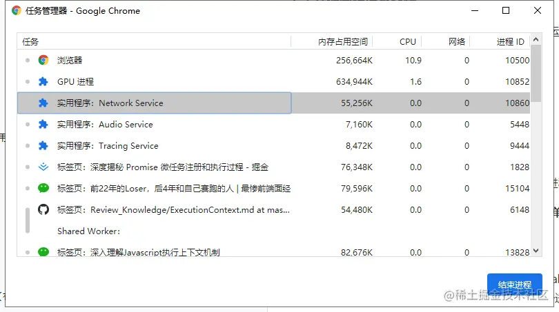 谷歌浏览器设置里打开任务管理器,每个任务就是一个进程