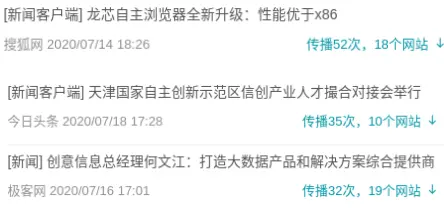 《天津国家自主创新示范区信创产业人才撮合对接会举行》排在热度榜第二名,累计在10个网站传播35次。据报道,7月16日,天津滨海高新区在华苑科技园举办天津国家自主创新示范区信创产业人才撮合对接会,为企业、合作院校和毕业生三方安排线下对接活动。来自南开大学、天津大学在内的6所高校的200余名毕业生与20家企业进行交流对接。