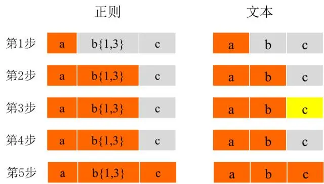 重点在第三部,黄色代表没有匹配上,这是因为正则默认是贪婪匹配,它会试图去匹配最多的次数,在第三步b{1,3}试图去寻找b,可是却出现了c,因此需要回溯到上一个位置重新匹配。