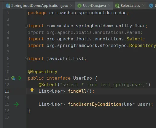 @Select注解后面的就是sql语句,@Select("select * from test_spring.user;"), 查询test_spring库的user表完成查询数据库的操作。