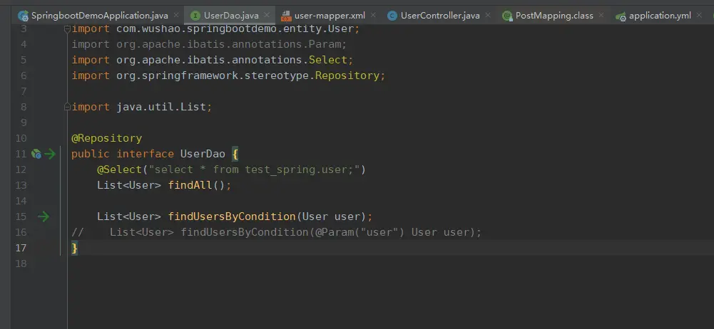 <select id="findUsersByCondition" resultType="com.wushao.springbootdemo.entity.User" parameterType="com.wushao.springbootdemo.entity.User">