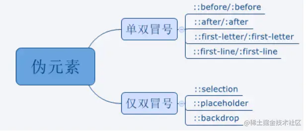 伪元素用于创建一些不在文档树中的元素,并为其添加样式。比如 :before 在一个元素前增加一些文本,并为该文本添加样式。