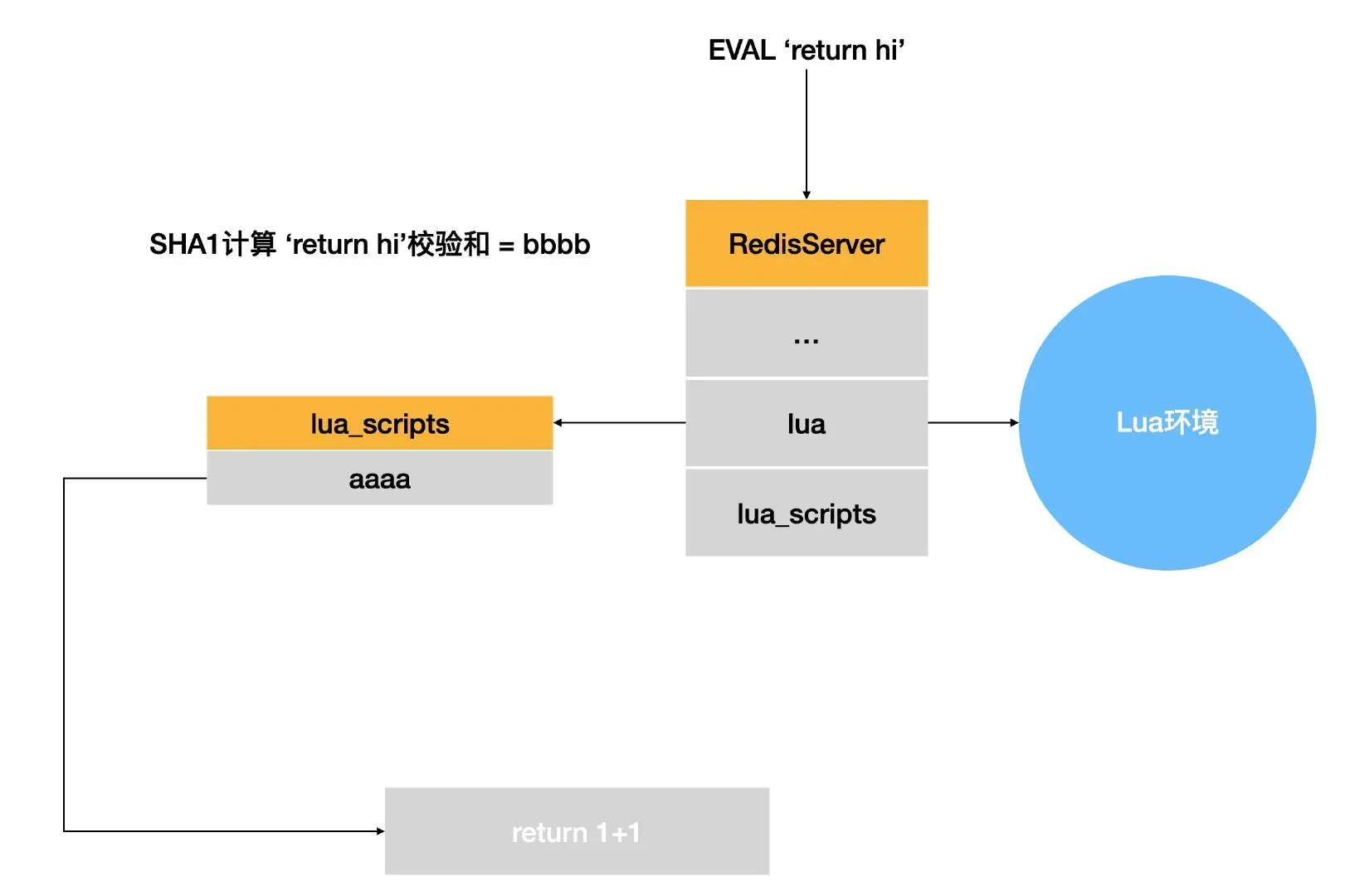 Redis服务器首先计算Lua脚本内容的sha1校验和,然后判断是否已存在,然后存进lua_scripts字典中