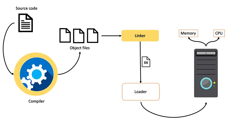 回到图中,正如所见,编译过程通常从源代码开始。实现代码,保存并运行。运行的进程依次从编译器开始。编译器是一个程序,像任何其他程序一样,运行在您的机器上。然后遍历所有代码并生成目标文件。那些文件就是机器代码。他们优化了运行在特定机器上的代码,这就是为什么当你从一个操作系统移动到另一个操作系统时,你必须使用特定的编译器。