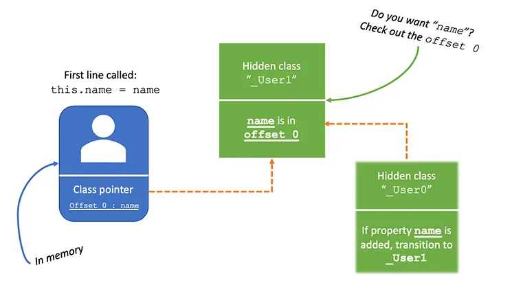 V8 will also add a transition value to the _User0 hidden class. This helps the interpreter to understand that every time a name property is added to a User object, the transition from _User0 to _User1 must be addressed.