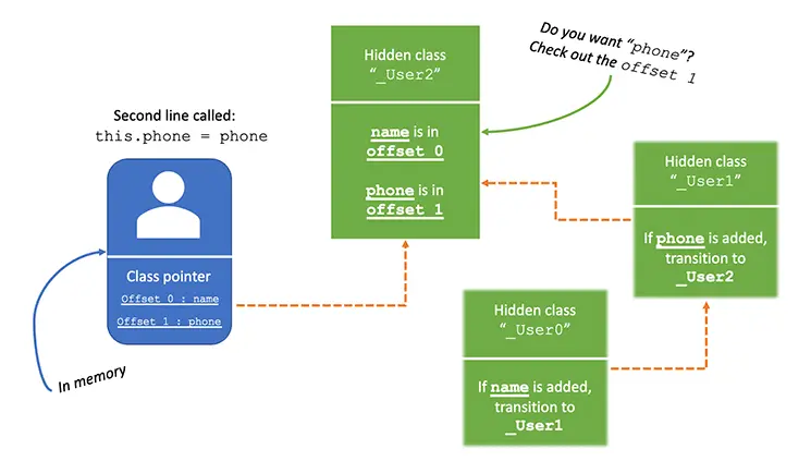 在将实例化的任意值作为参数的用户对象两次发送给一个函数后,V8将跳过隐藏类查找并直接转到偏移量的属性。这要快得多。