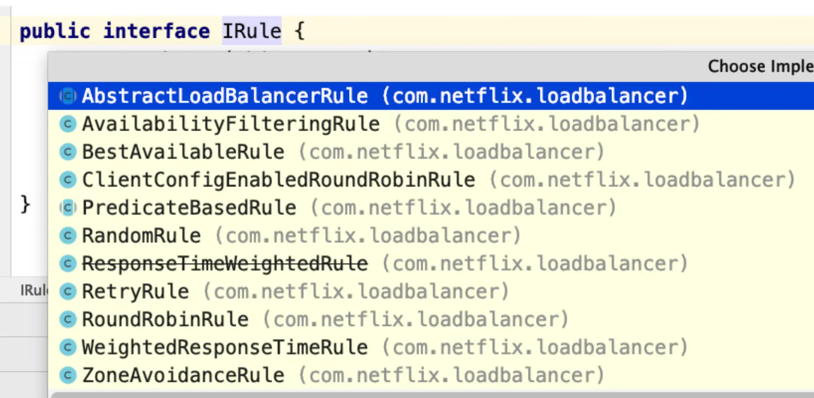 - Ribbon内置了多种负载均衡策略,内部负责复杂均衡的顶级接⼝为 com.netflix.loadbalancer.IRule ,类树如下