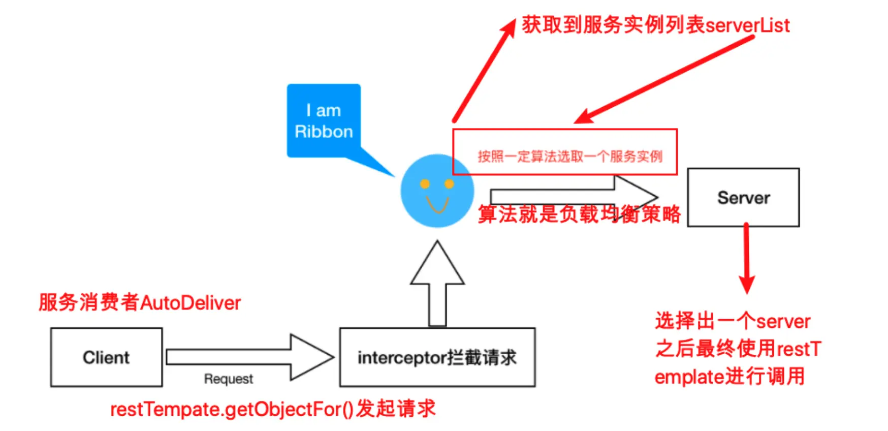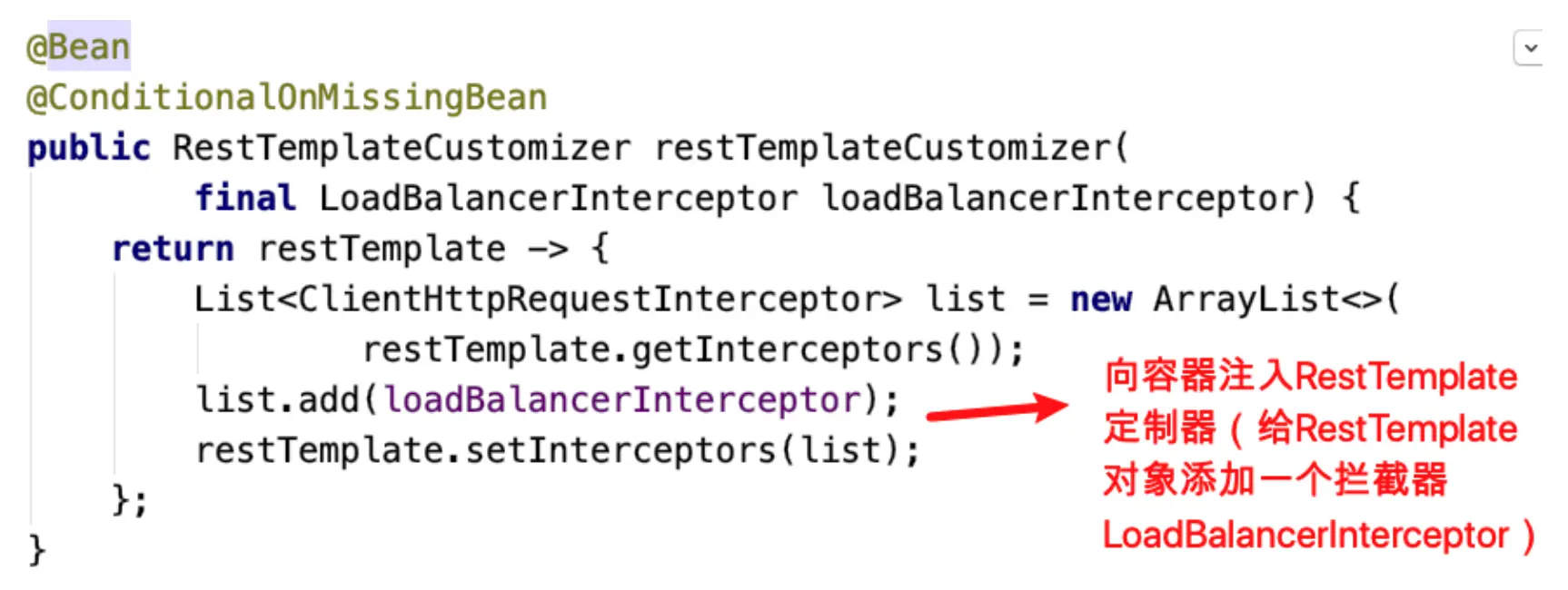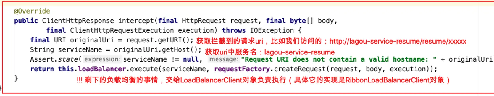 - 到这⾥,我们明⽩,添加了注解的RestTemplate对象会被添加⼀个拦截器LoadBalancerInterceptor,该拦截器就是后续拦截请求进⾏负载处理的。 所以,下⼀步重点我们该分析拦截器LoadBalancerInterceptor------>>>intercept()⽅法==========》》》》分析LoadBalancerInterceptor.intercept()⽅法