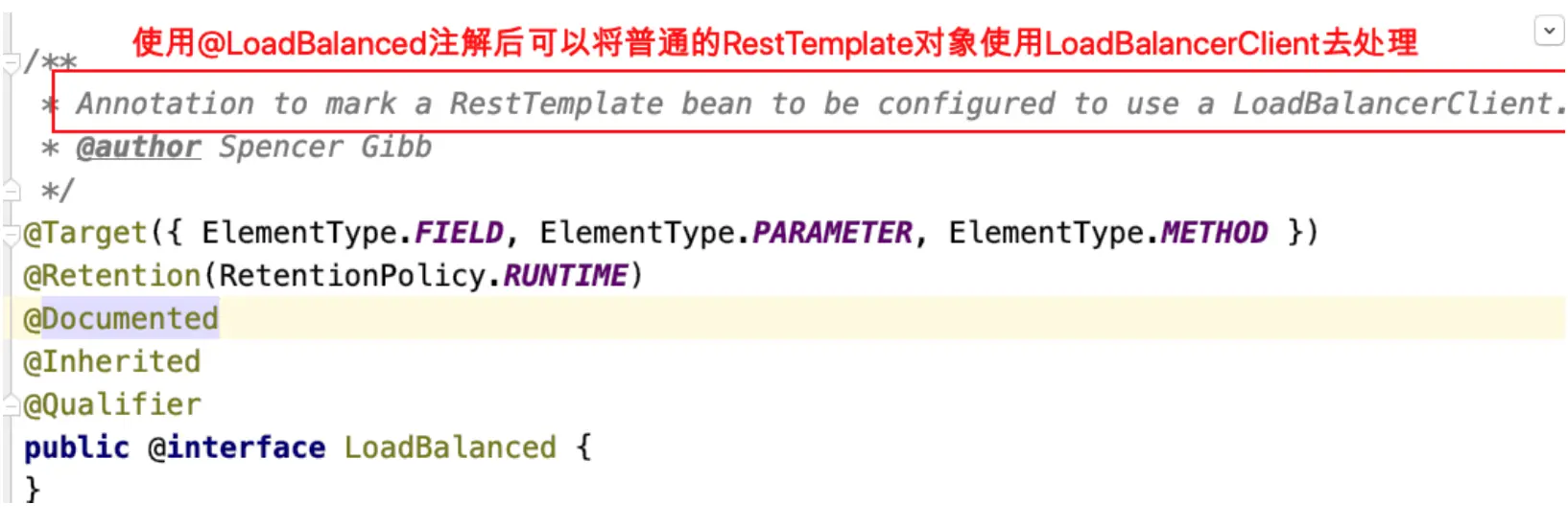 我们在RestTemplate实例上添加了⼀个@LoadBalanced注解,就可以实现负载均衡,现在来来分析这个注解背后的操作(负载均衡过程)