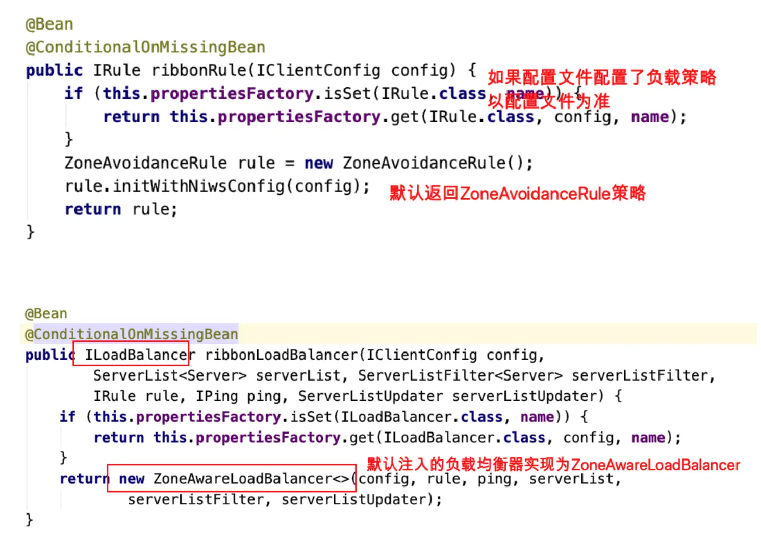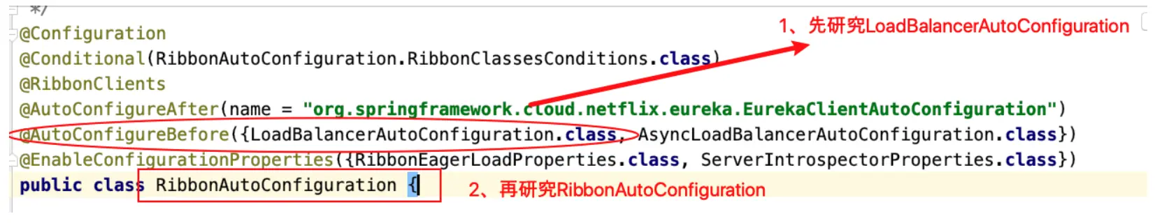 - SpringCloud充分利⽤了SpringBoot的⾃动装配特点,找spring.factories配置⽂件,进入org.springframework.cloud.netflix.ribbon.RibbonAutoConfiguration