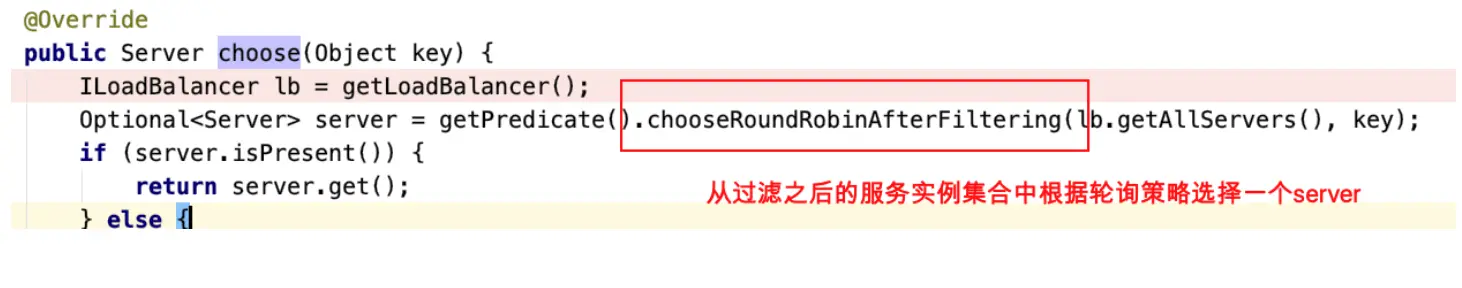 - 来到区域隔离策略的⽗类choose⽅法中com.netflix.loadbalancer.PredicateBasedRule#choose