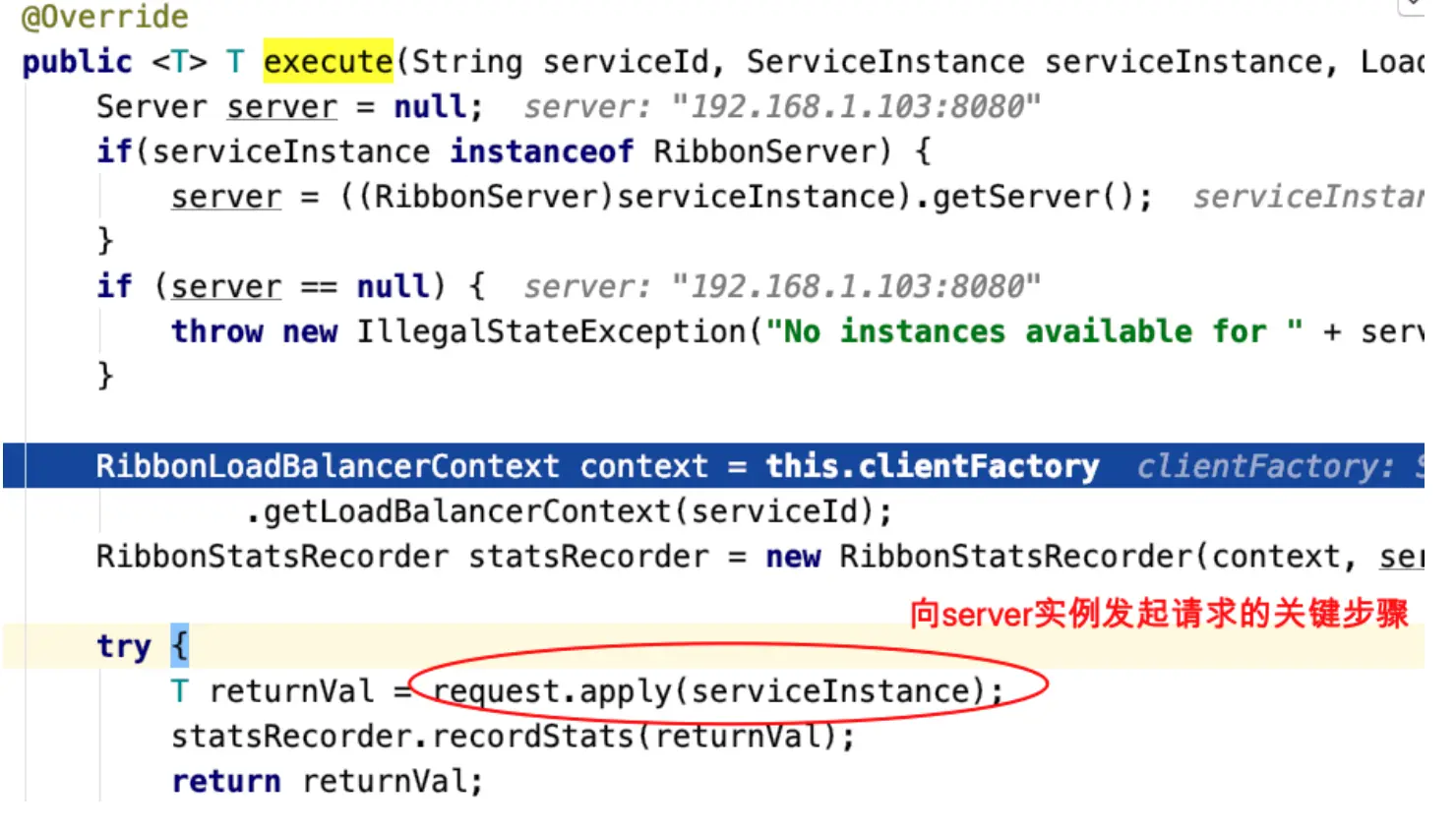 - 最后执行在 org.springframework.cloud.netflix.ribbon.RibbonLoadBalancerClient#execute