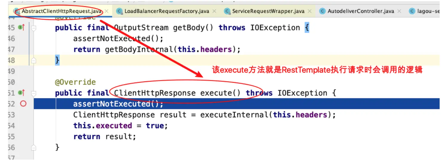 - AbstractClientHttpRequest#execute此处,就已经到了RestTemplate底层执⾏的代码了,由此也将验证最终请求的调⽤还是靠的RestTemplate
