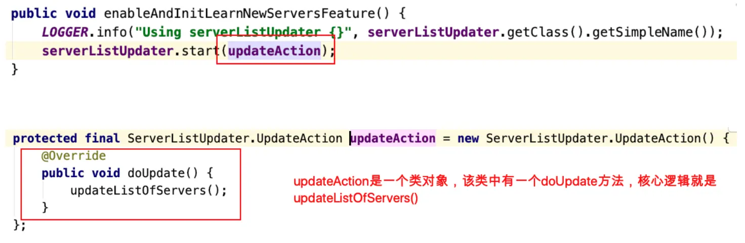 - 进⼊enableAndInitLearnNewServersFeature()⽅法,底层com.netflix.loadbalancer.DynamicServerListLoadBalancer#updateAllServerList也是CAS控制并发
