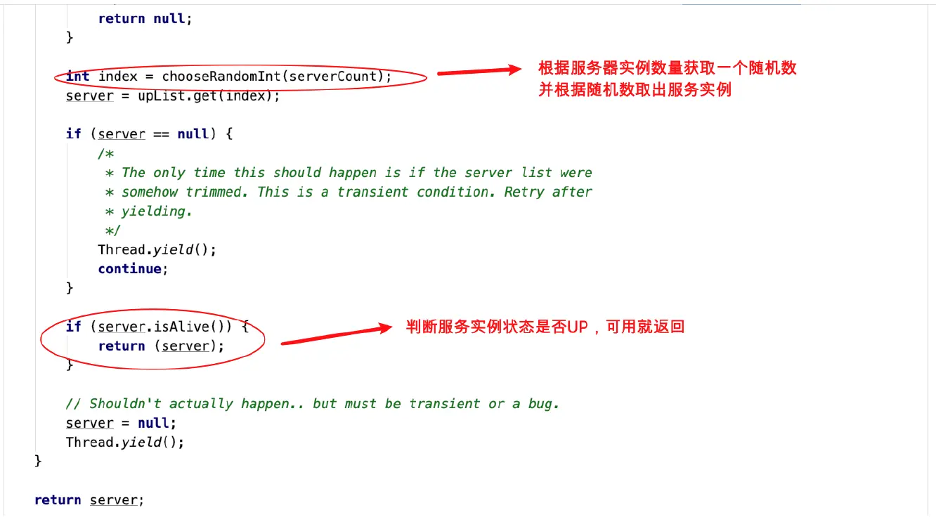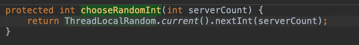 来到com.netflix.loadbalancer.RandomRule,跟轮训不一样就是没有循环10次就抛异常,无限循环随取,核心随机方法就是线程随机数如下: