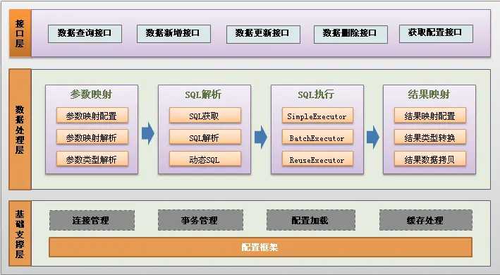 接口层是对外的的api,主要使用sqlSession接口,通过sqlsession接口、mapper接口,开发人员可以通知mysql调用哪一条sql以及相关参数