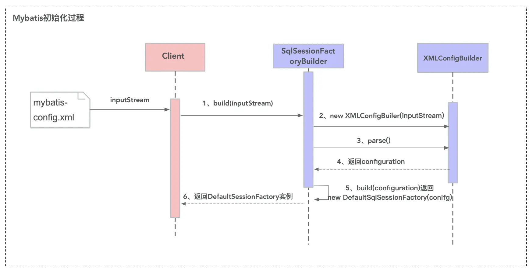 //6、SqlSessionFactoryBuilder 返回 DefaultSessionFactory 对象给 Client ,供 Client使用。