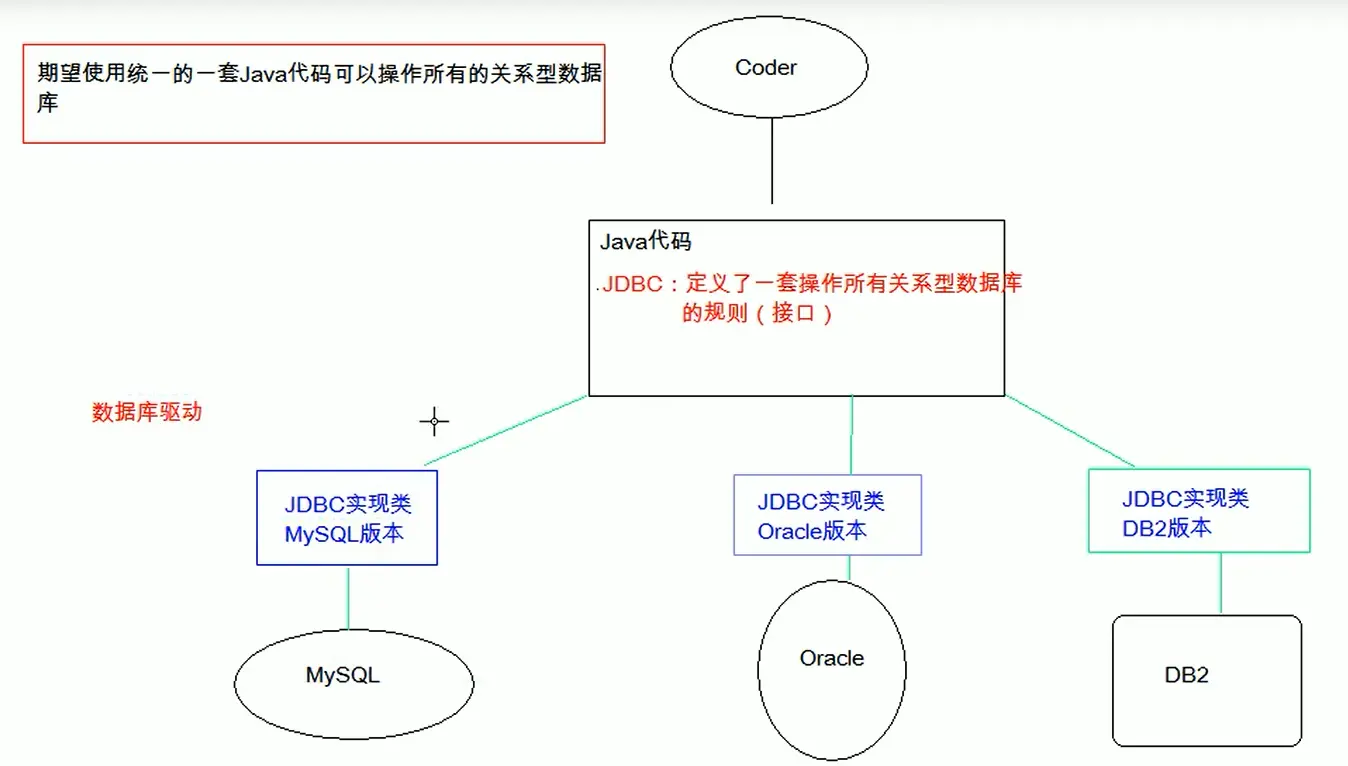 官方(sun公司)定义的一套操作所有关系型数据库的规则,即接口。各数据库厂商去实现这套接口,提供数据库驱动jar包。我们使用这套接口(JDBC)编程,根据多态性质,真正执行的代码是驱动jar包中的实现类