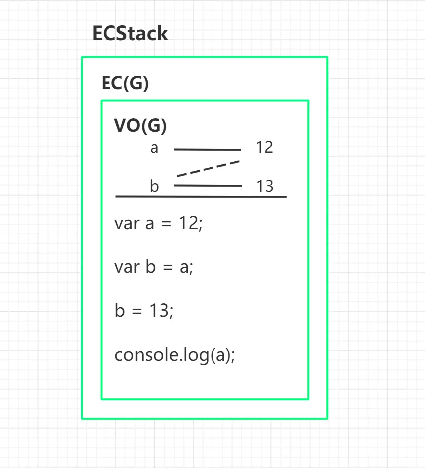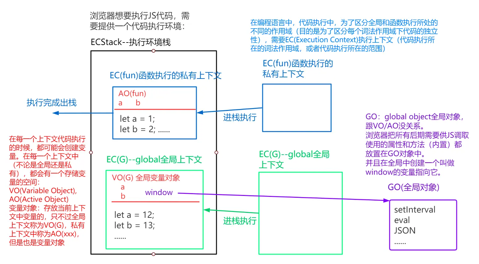 1. 浏览器执行JS代码,提供一个执行环境栈ECStack,并将全局执行上下文EC(G)入栈,每一个上下文中都由一个存储变量对象的空间VO,在全局下是VO(G)