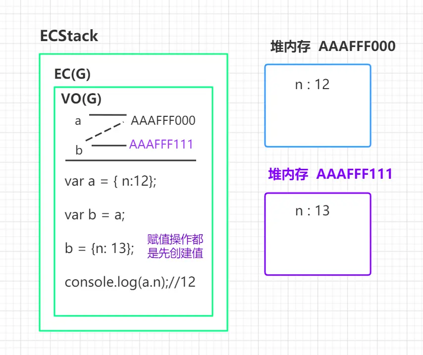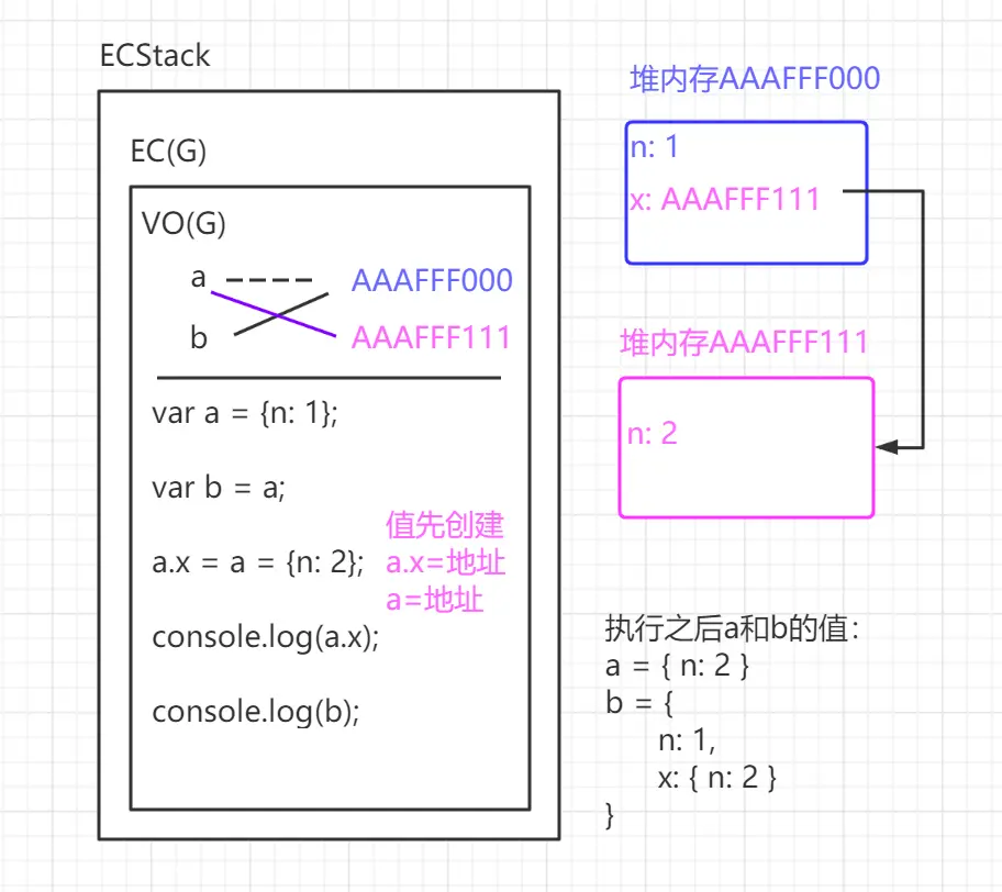 5. a.x = a = {n: 2}; 首先是创建值,新开辟一个堆内存AAAFFF111,里面存储{n: 2},然后将地址值放入VO(G),然后根据运算符的优先级,先让a.x = AAAFFF111,再让a = AAAFFF111,而对于a.x怎么找到?需要根据AAAFFF000找到对应的堆空间,发现其中没有x的属性,就会自行创建一个x属性,然后把AAAFFF111作为x的属性值存储在AAAFFF000中。以后就会通过堆内存AAAFFF000中的x指向堆内存AAAFFF111。接下来将VO(G)中的a变量的值变为AAAFFF111