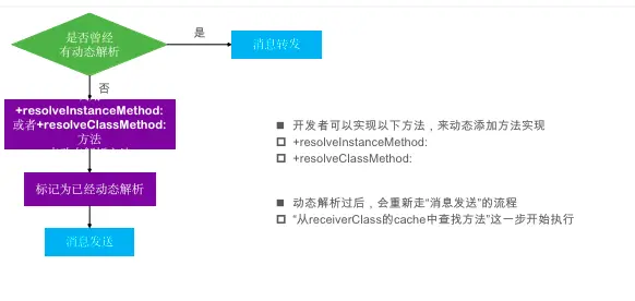 [cls resolveInstanceMethod:sel],元类对象调用[nonMetaClass resolveClassMethod:sel],然后把这个方法实现,放入class_rw_t的mthods里,注意不是放缓存(除非手动调用),是放方法二维数组里。
