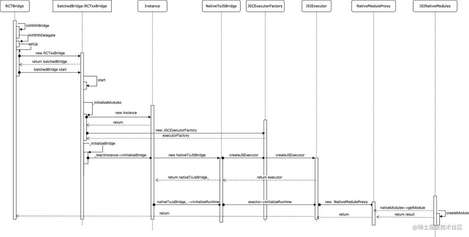 初始化了 RCTBridge;并在 RCTxxBridge 中开启 JS 执行线程;绑定了一个 runRunLoop 方法,保证所有的 js 代码都在此线程执行