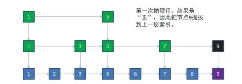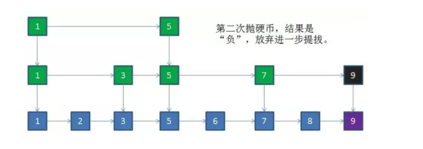 跳表设计者采用了“抛硬币”的方法,随机决定新节点是否提拔。因为跳表的添加和删除的节点是不可预测的,很难用算法保证跳表的索引分布始终均匀。虽然抛硬币的方式不能保证绝对均匀,但大体上是趋于均匀的。