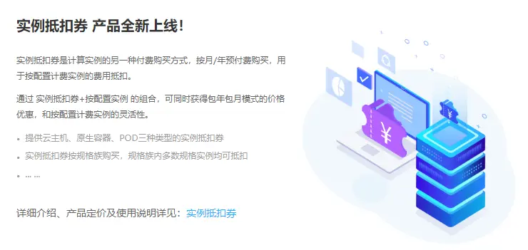 实例抵扣券是一种全新的计算实例(云主机、原生容器、POD)付费方式,按月/年预付费单独购买后,用于后付费的实例在结算时进行抵扣。