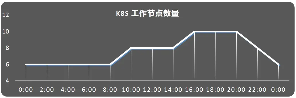 以使用K8S部署的线上web服务为例,通常业务会以天存在周期性负载波动。其中,稳定负载对应的节点数量一定适合购买与其计算力相当的实例抵扣券,波动负载对应的实例可以根据波动周期统计下运行时长,然后对比实例小时单价和抵扣券月价,计算有多少数量的实例适合购买抵扣券。在下图的实例中,节点数量以天为单位在6~10之间波动,假设该规格对应的抵扣券月价折合成小时价格后,是标准小时定价的0.4倍,也就是说日运行时长超过24*0.4=9.6小时的实例使用抵扣券都更为划算,那么显然在这个例子中,除了持续运行的6个节点,有2个节点每日运行时长超过了9.6个小时,因此为6+2个实例购买抵扣券,可以最大程度节省费用。