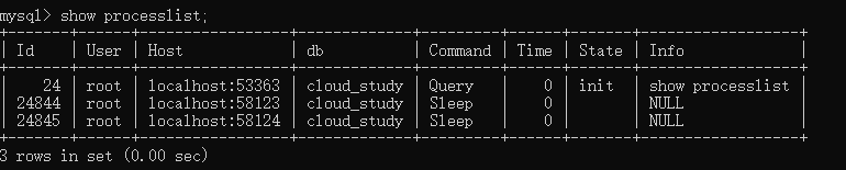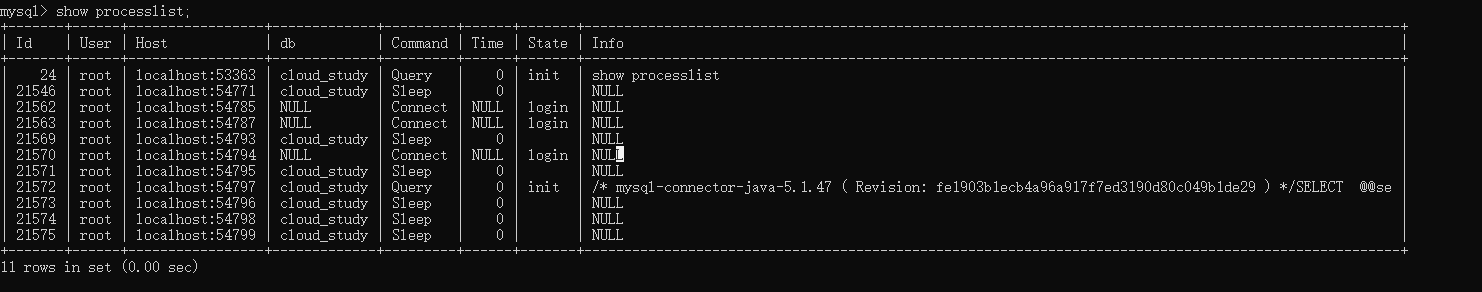 运行main方法,我们立即用show processlist命令查询创建的连接数。