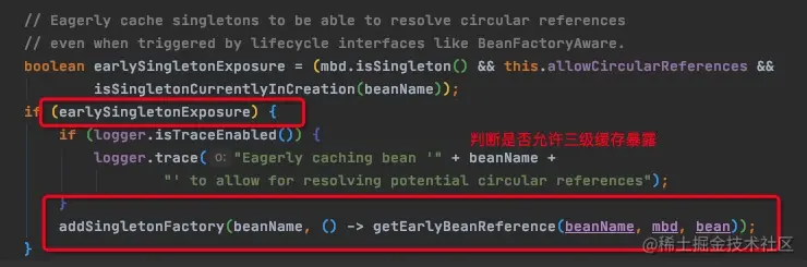 然后会把A进行反射实例化获得A的原始对象,这个时候回去判断是不是允许进行三级缓存,如果允许,会把刚创建出来的原始对象,外层包装上一个工厂方法,为了可以提前进行AOP。如果不允许的化就会只把对象放到二级缓存的