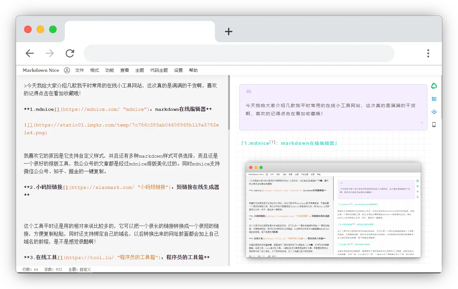 我喜欢它的原因是它支持自定义样式,并且还有多种markdown样式可供选择,而且还是一个很好的排版工具,我公众号的文章都是经过mdnice排版美化过的。同时mdnice支持微信公众号、知乎、掘金的一键复制。