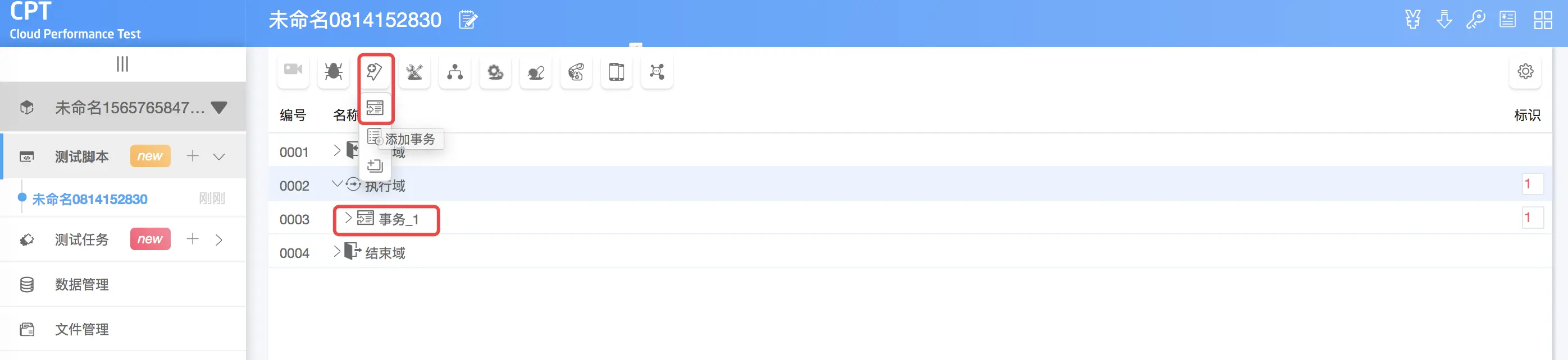 2.添加事务:选中右侧执行域,点击上方菜单添加事项->添加事务;或者单击鼠标右键,选择添加事项->添加事务,添加事务后,在执行域中自动添加【事务_1】;