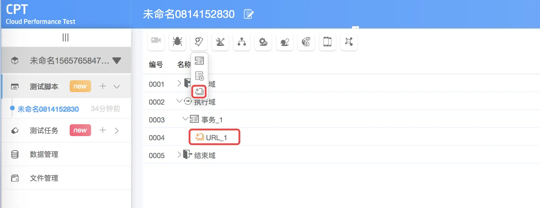 3.添加URL请求:展开【事务_1】后选中【事务_1】,点击上方菜单添加事项->添加URL请求;或者单击鼠标右键,选择添加事项->添加URL请求,添加URL后,在【事务_1】下自动添加【