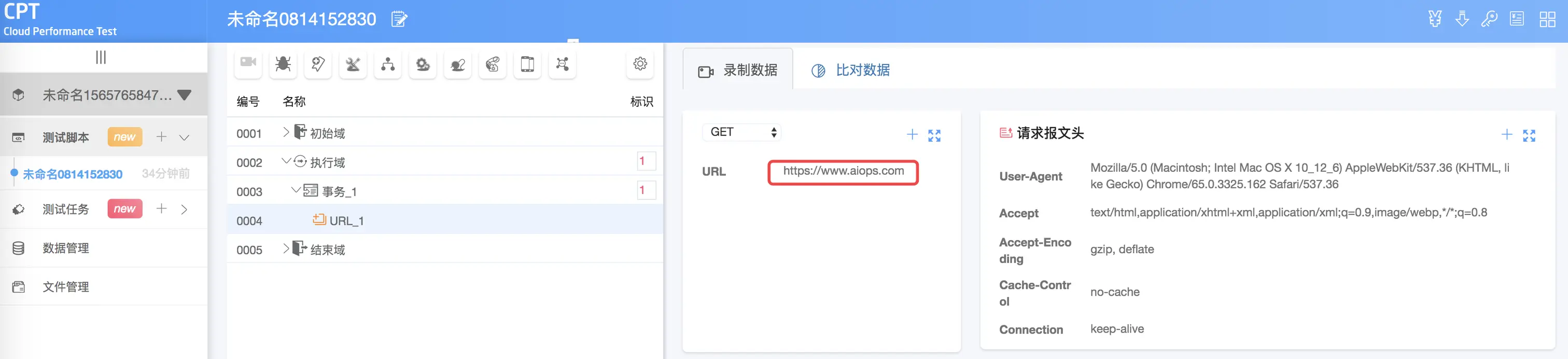 4.编辑URL请求:选中【URL_1】后,在右侧页面【URL】中输入url请求(例如输入:https://www.aiops.com),输入后移开鼠标自动保存;