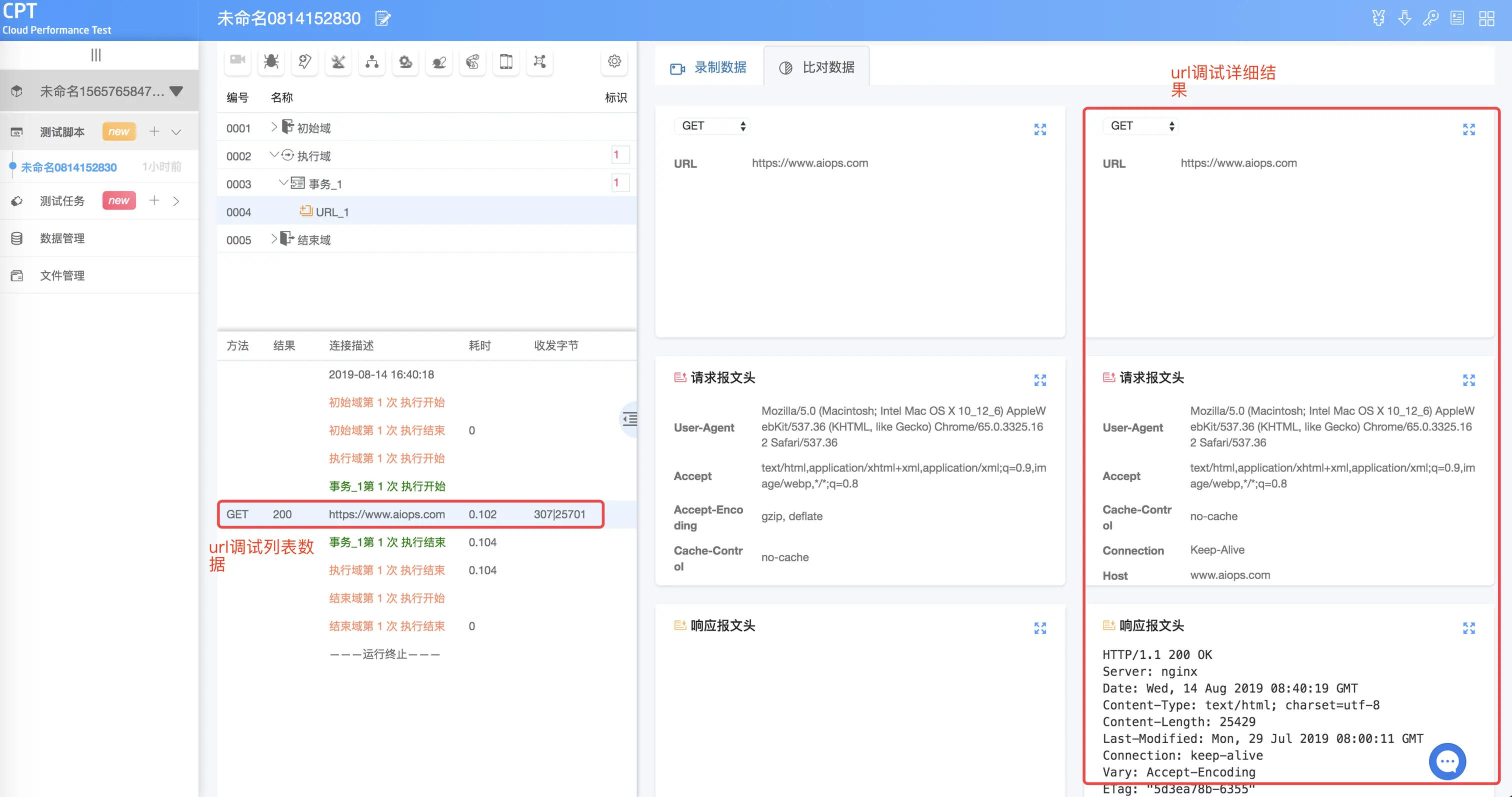 5.调试脚本:点击上方菜单的调试按钮,自动调试脚本,下方显示调试结果;点击调试结果链接,右侧展示调试结果比对数据,比对数据中右侧为本次调试结果详细数据。