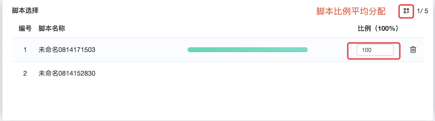 2.选择测试脚本:在右侧脚本选择处,鼠标点击选择测试的脚本,输入比例100(比例和必须为100%)或点击右上角的【平均分配按钮】,即完成脚本的选择;