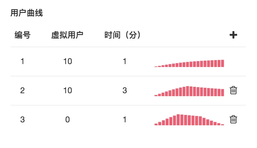 3.编辑用户曲线:默认为【10个虚拟用户】X【5分钟】,其中1分钟爬升到10VU,10VU持续3分钟,1分钟虚拟用户下降至0VU;