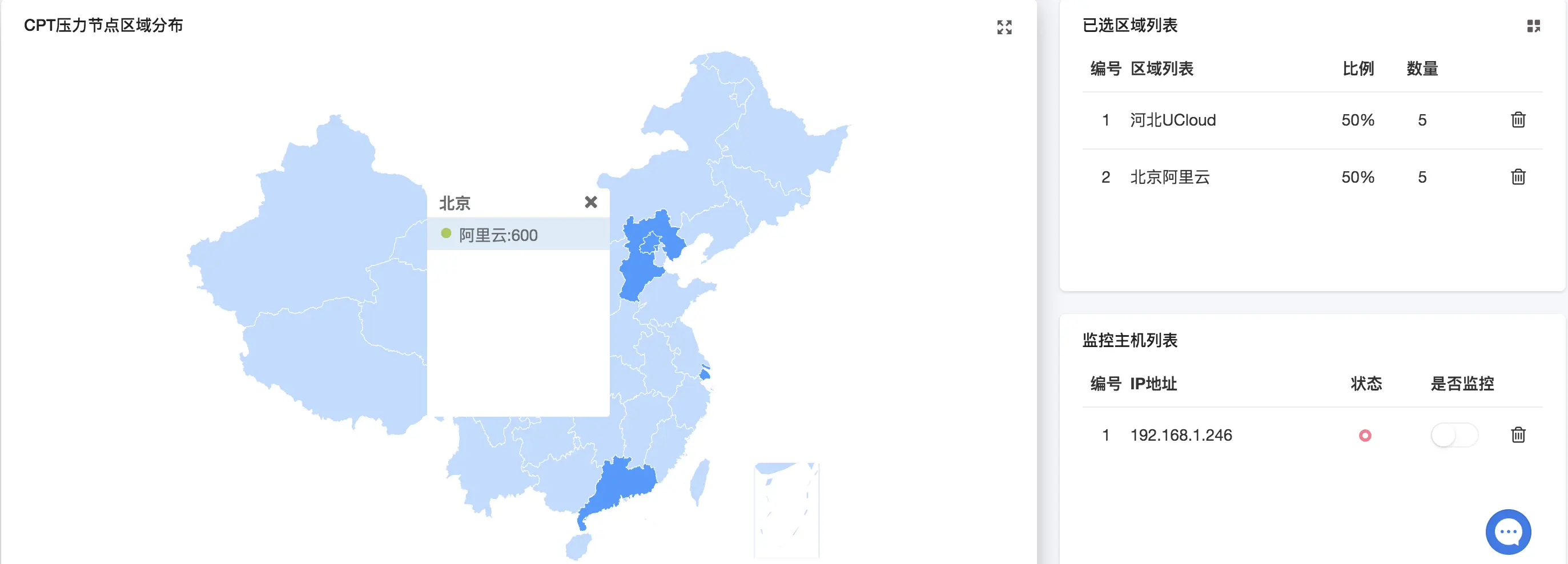 4.选择压力节点:在地图中选择压力区域后后,在列表中选择云厂商,选择后右侧已选择列表中自动添加和平均分配区域执行脚本数量;
