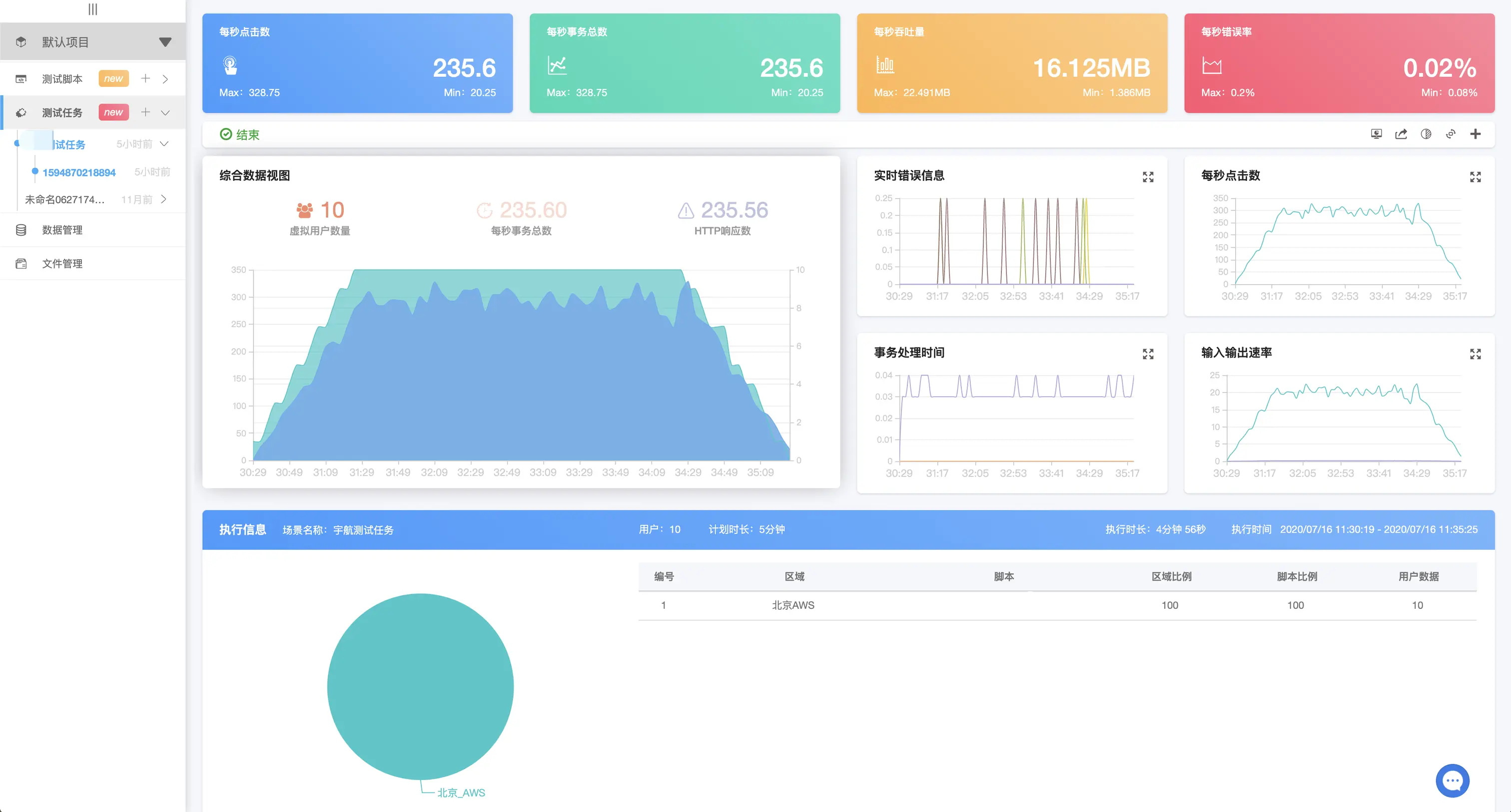 6.执行任务:点击测试任务右上角的【执行】,执行测试任务.任务执行后自动跳转至报告页面,报告页面实时展示测试数据。