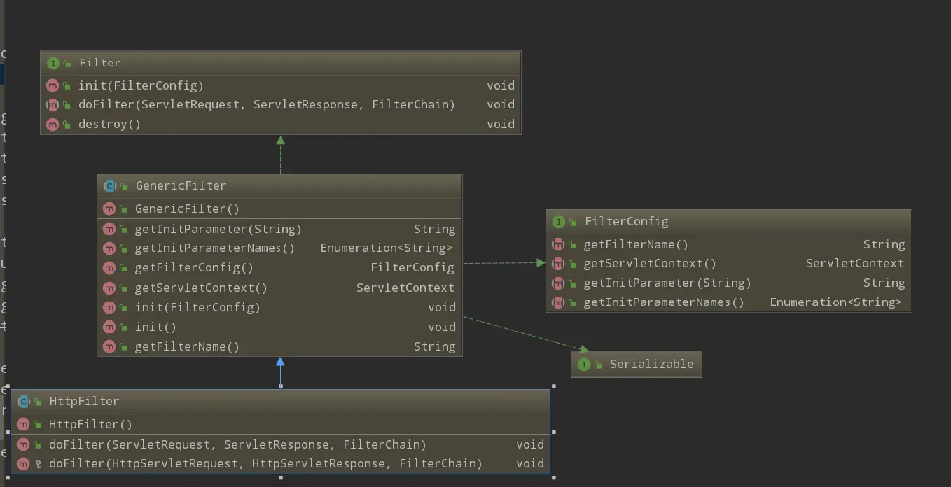 那要如何实现一个Filter呢,这里我又把Filter的各子类关系图给大家放出来了,从图中可以看出,要想实现一个过滤器,可以直接实现Filter接口,也可以继承他的子类,对于Http请求,则可以直接继承HttpFilter。