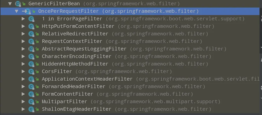 这张图是Spring给我们提供的所有Filter, 我们在自己定义Filter时其实可以通过实现OncePerRequestFilter. 具体它都实现了什么,以及每个Filter都有怎样的用处,我们会在下一篇文章中详细阐述。